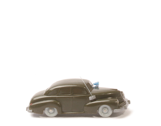 Achsen | Rollachser | Farbe Karosserie | olivgrün | Version | mit Griffen an Türen und am Kofferraum | Chassis | silbern | Bodenprägung | WM im Kreis | Schlepploch | mit | Zughaken | ohne | Blaulicht | mit Sockel, auf Dach | Bemalung Scheinwerfer | silber | Antennenhalterung | Beifahrerseite, silbern | Bemalung Rückleuchten | rot | Bemalung Kennzeichen hinten | ohne | Räder | sog. Porzellanräder |