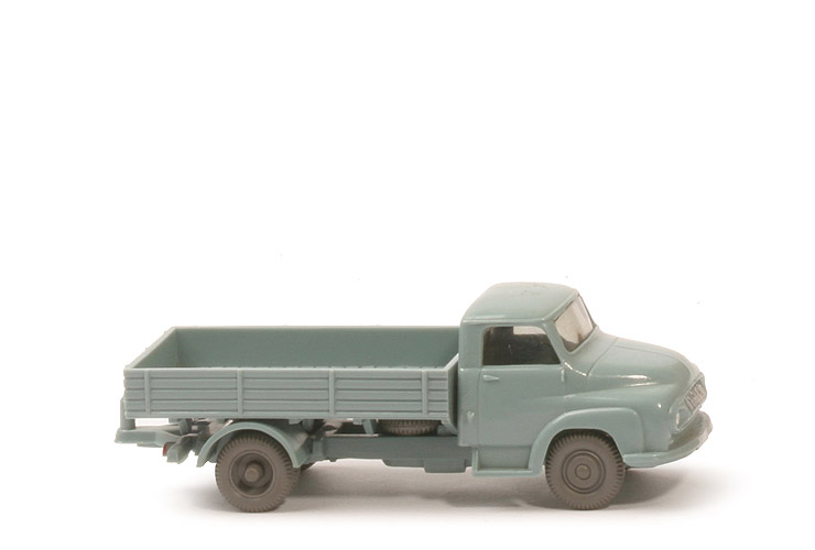 Kabine | grünblau | Verglasung | getönt | Inneneinrichtung | ohne | Bemalung Scheinwerfer | silber | Bemalung Grill | silber | Bemalung Kennzeichen vorne | silber | Farbe Pritsche | grünblau | Pritscheneinlage | ohne | Chassis Typ | im Bereich der Hinterachse offen | Chassis Farbe | grünblau | Bodenprägung | WM | Bemalung Rückleuchten | rot | Bemalung Kennzeichen hinten | silber | Reserverad | auf Chassis | Plane | ohne | Räder | 10 mm, hellgrau |