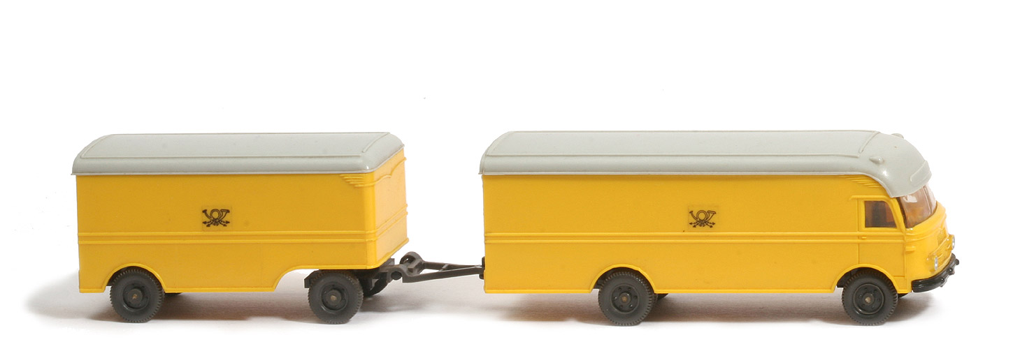 | | Zugwagen | | Aufbau Farbe | gelb | | Blinker vorne | mit | | Verglasung | klar | | Inneneinrichtung | schwarz | | Fahrer | ohne | | Kotflügel | Teil des Aufbaus | | Rückleuchten | klein | | Dach Farbe | achatgrau | | Dach Art | matt, mit Positionsleuchten, mit Streben | | Türen | achatgrau | | Türen Art | Typ 3: niedrig, mit Streben, mit Griff | | Chassis Art | Typ 4 | | Chassis Farbe | schwarz | | Bodenprägung Motorblock | Punkt | | Bodenprägung hinten | WIKING GERMANY | | Achshalterung vorne | offen | | Achshalterung hinten | offen | | Fläche unter hinterem Kardan | geschlossen | | Fläche hinter Hinterachse | geschlossen | | Tank | mit | | | Anhänger | | Aufbau Farbe | gelb | | Kotflügel | Teil des Aufbaus | | Dach Farbe | achatgrau | | Dach Art | matt, mit Streben | | Türen | achatgrau, wie Zugwagen | | Chassis Farbe | schwarz | | Bodenprägung | WIKING GERMANY ohne 50a | | Beschriftung | Horn Folie | | Räder | 11mm 6-Loch Profil grob |