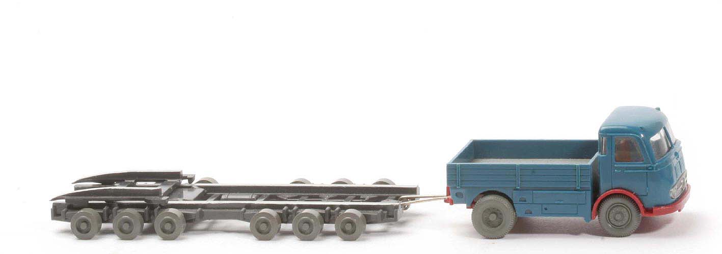 | Zugmaschine | Kabine Farbe | azurblau | Fenstersteg | breit | Fixierung Reserverad | mit | Verglasung | klar | Inneneinrichtung | hellbraunrot | Grill | silbern eingesetzt | Chassis | hellbraunrot | Bodenprägung | WM, Made in Germany | hintere Stoßstange links | mit | Zughaken | mit | hintere Stoßstange rechts | mit | Pritsche | azurblau | Pritscheneinlage -Typ | Längsverbretterung, 12-geteilt | Pritscheneinlage - Farbe | silbern | Räder | 10-Loch, hellgrau | Ladegut | ohne | | Anhänger | Farbe | anthrazit | Bodenprägung | nur WM im Kreis | Bremsplatte | Fläche glatt | Bemalung | Gleise silbern | Deichsel | Metall | Räder | Walzenräder, 7,8mm o. Profil | Farbe Räder | basaltgrau |