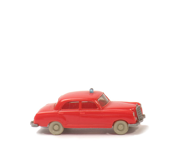 Farbe Karosserie | orangerot | Blaulicht | auf Dach verklebt | Bemalung vorne | Scheinwerfer, Nebelscheinwerfer silber | Bemalung Rückleuchten | ohne | Grill | silbern, eingesetzt, mit Stern | Verglasung | leicht getönt | Inneneinrichtung | ohne | Chassis Farbe | silbern | Bodenprägung | WM, Merc. 220 | Ölwanne | gerillt | Räder | fast perlweiß |