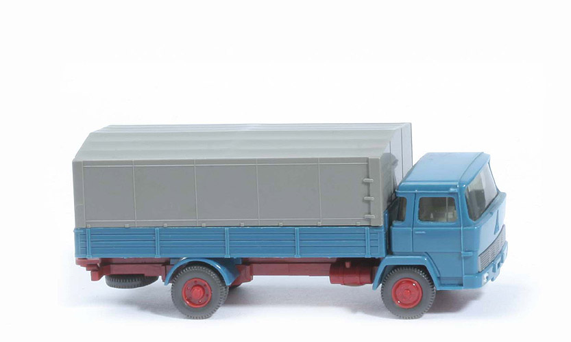 Farbe Kabine | azurblau | Spiegel | ohne | Verglasung | getönt | Grill | silbern eingesetzt | Bemalung | Scheinwerfer | Inneneinrichtung | 2 Sitze, Motorblock | Armaturenbrett, Lenkrad | ohne | Farbe Innenrichtung | ca. gelbgrau | Chassis Farbe | hellbraunrot, glänzend | Bodenprägung | GERMANY, WM | Zughaken | mit | Reserverad | hinten unter Chassis gesteckt | hinterer Kotflügel | azurblau | Pritsche Farbe | azurblau | Pritscheneinlage | silbern | Bemalung Rückleuchten | ohne | Plane | hinten offen, gerafft | Farbe Plane | ca. betongrau | Räder | 11mm, Felge eingesetzt | Felgenfarbe | hellbraunrot |