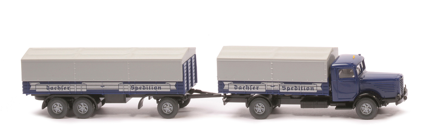 | Zugwagen | Kabine | intensiv stahlblau | Verglasung | klar | Inneneinrichtung | ca. silbergrau, mit Lenkrad | Bedruckung Scheinwerfer | silber | Bedruckung Grill | silbern | Warndreieck | gelb | Chassis Farbe | schwarz | Chassis Typ | geschlossen (nur bis 1994) | Bodenprägung | neues WIKING-Logo, Berlin-W, Germany | Zughaken | klein | Reserverad | auf Chassis | Bedruckung Rückleuchten | ohne | Pritsche | intensiv stahlblau | Bedruckung Pritsche | Dachser Spedition, silbern Negativdruck | Pritscheneinlage | ohne | Plane | geschlossen, silbergrau | | Anhänger | Typ | neuer Dreiachs-Anhänger | Pritsche | intensiv stahlblau | Druck Pritsche | Dachser Spedition, silbern Negativdruck | Pritscheneinlage | ohne | Chassis | schwarz | Bodenprägung Chassis | neues WIKING-Logo, GERMANY | Fixierung Drehschemel | per Weichzapfen | Plane | geschlossen, silbergrau | | Räder | Typ | 12mm, Felgen eingesetzt | Felgen | Trilex, silbern |