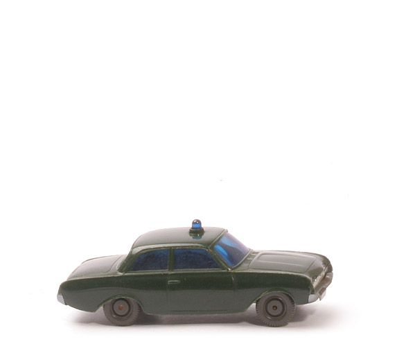 Farbe | tannengrün | Chassisfarbe | silbern | Verglasung | blautransparent | Blaulicht | durchgesteckt, Teil der Verglasung | Inneneinrichtung | ohne | Bodenprägung | ohne "20" | Bemalung Scheinwerfer | ohne | Bemalung Blinker | ohne | Bemalung Grill | silbern | Bemalung Rückleuchten | ohne | Räder Art | Nabe glatt | Räder Farbe | anthrazit | Beschriftung | "Polizei" Nassschieber am Heck |