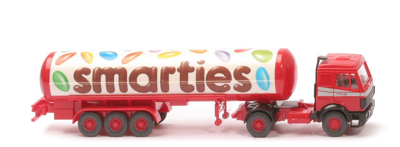 | | Zugmaschine | | Fahrerhaus | rot | | Verglasung | klar | | Inneneinrichtung | lichtgrau mit separat eingesetztem Lenkrad | | hintere Seitenscheibe | geschlossen | | Scheibenwischer | plastisch | | Grill | umlaufend, schwarz, Stern silbern bedruck | | Kotflügel vorne, Stoßstange | schwarz | | Scheinwerfer | silbern eingesetzt | | Bedruckung Kabine | silbernes Band, 1748 im Negativdruck | | Ansaugstutzen | hinter Kabine, schwarz | | Chassis | rot, geschlossen | | Chassis Bodenprägung | WIKING - altes Logo | | Sattelpfanne | silbern, mit geschlossenem Verriegelungsgriff | | Kotflügel hinten | schwarz | | | Auflieger | | Tankkorpus | weiß | | Tank vordere Endkappe | rot | | Tank hintere Endkappe | rot | | Chassis | rot | | Bodenprägung Chassis | WIKING Berlin-W | | Beschriftung | smarties ... (s. Foto) | | Stützen | als Rollen, eingesetzt | | 3-Achsaggegat Farbe | rot | | 3-Achsaggegat Typ | Kotflügel rund, integriert | | Warndreiecke | neben Rückleuchten | | Räder | 12mm, Profil grob | | Felgen | 8-Loch, rot |