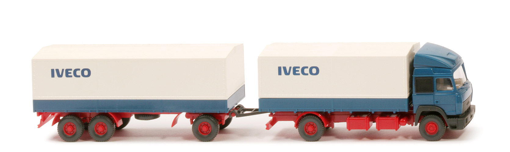 | Zugwagen | Kabine, Dachspoiler | capriblau | Verglasung | klar | hintere seitl. Kabinenfenster | schwarz geschlossen | Inneneinrichtung | ca. graubeige, Lkr integriert | Stoßstange, Grill | anthrazit | Ansaugstutzen | anthrazit | Chassis | rot | Bodenprägung Chassis | neues WIKING-Logo, Germany | Radlauf hinten | schwarz | Reserverad | seitlich unter Chassis | Pritsche | capriblau | Pritscheneinlage | Papier silbern | Plane | weiß | Beschriftung | Iveco | Beschriftung Art | Druck stahlblau | Räder | 12 mm, Felgen eingesetzt | Felgen | 8-Loch, rot | | Anhänger | Pritsche | capriblau | Pritscheneinlage | Papier silbern | Plane | weiß | Beschriftung | Iveco | Beschriftung Art | Druck stahlblau | Chassis | rot | Bodenprägung | WIKING, Berlin-W | Achshalterungen | rot | Unterfahrschutz | mit | Räder | 12 mm, Felgen eingesetzt | Felgen | 8-Loch, rot |