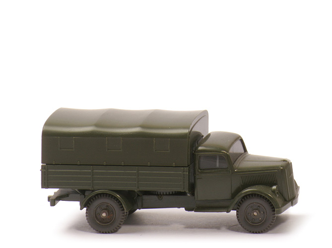 Kabine | olivgrün | Verglasung | getönt | Blitz auf Grill | mit | Chassis Farbe | olivgrün | Chassis Bodenprägung | WM | Zughaken | ohne | Chassis hinten | geschlossen | Reserverad | unter Pritsche mittig | Pritsche | olivgrün | Pritsche Bodenprägung | 335, WIKING Germany | Pritscheneinlage | gelbgrau | Bemalung | ohne | Plane | olivgrün | Räder | 11mm, Profil grob, anthrazit |