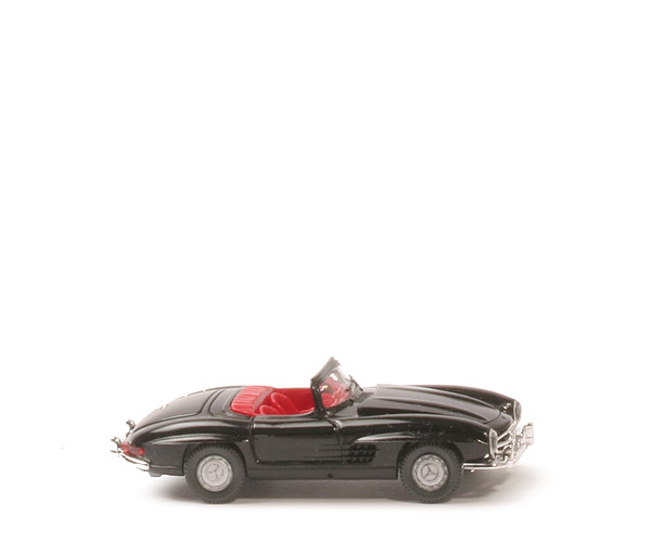 Karosserie | schwarz | Motorhaube | schwarz, zum Öffnen | Motorblock | silbern | Grill | separat eingesetzt, verchromt | Windschutzscheibe | klar, im Rahmen gefasst | Inneneinrichtung | rot, Lenkrad separiert | Scheinwerfer | separat eingesetzt, klar transparent | Rückleuchten | separat eingesetzt, rot transparent | Stoßstangen | separat eingesetzt, verchromt | Chassis Farbe | silbern | Achshalterungen | geschlossen | Bodenprägung | neues WIKING-Logo, Mercedes 300 SL Germany | Bedruckung Heck | MB Stern, "300 SL" in silber | Räder Typ | 8 mm, anthrazit, Mercedes-Felgen | Felgen | gesilbert |