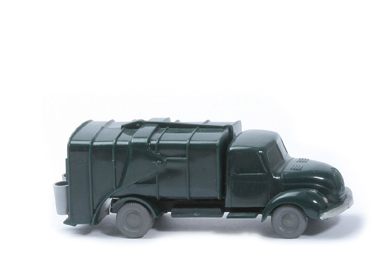 Modellart | unverglaster Rollachser | Farbe Kabine | schwarzgrün | Version Kabine | Typ 2 | Stoßstange | leicht abgeschrägt | Kabine unten | ohne Schlitz, Stoßstange grazil | Blinker | ohne | Dach | glatt | Bemalung | Scheinwerfer, Stoßstange | Achshalterungen | geschlossen | Chassis Farbe | schwarzgrün | Bodenprägung | WM im Kreis | Aufbau | schwarzgrün | Version | ohne Haltenase | Warnbake | ohne | Mülltonnen | 2 angesteckt, silber | Bemalung Nummernschild | silber | Bemalung Rückleuchten | rot | Räder | 10mm, ältere Ausführung |