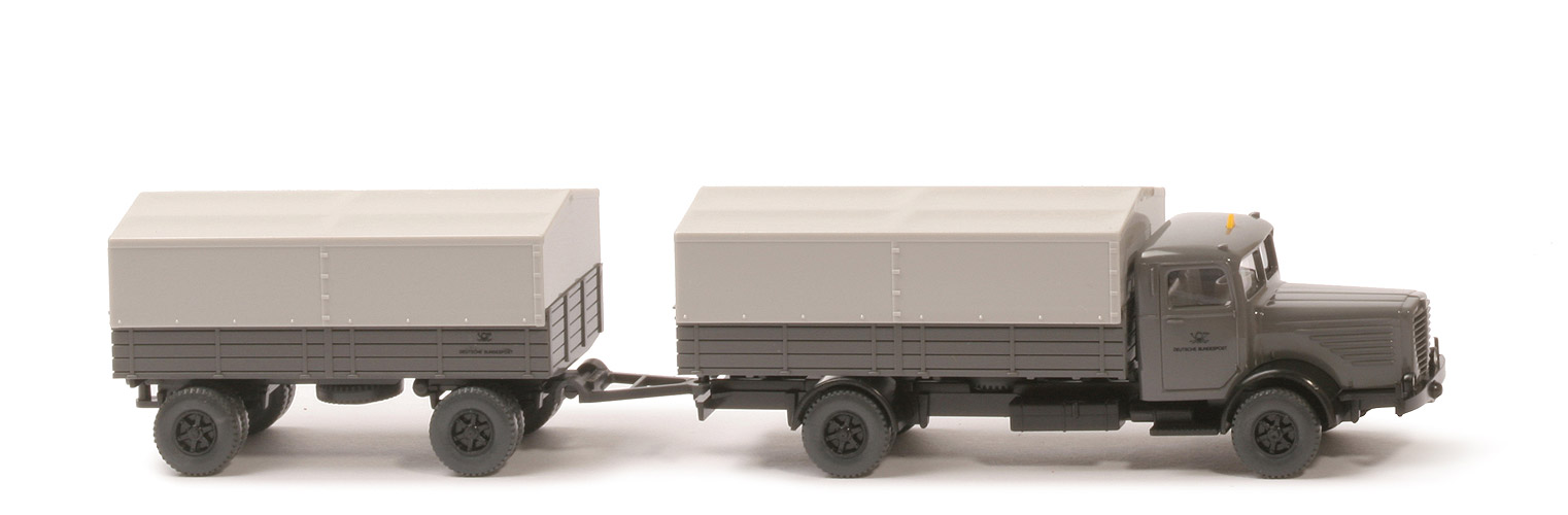 | Zugwagen | Kabine | basaltgrau | Verglasung | klar | Inneneinrichtung | ca. altweiß, mit Lenkrad | Bedruckung Scheinwerfer | silber | Bedruckung Grill | ohne | Bedruckung Türen | Posthorn, "Deutsche Bundespost" | Warndreieck | gelb | Chassis Farbe | schwarz | Chassis Typ | geschlossen | Bodenprägung | neues WIKING-Logo, Berlin-W, Germany | Zughaken | klein | Reserverad | auf Chassis | Bedruckung Rückleuchten | ohne | Pritsche | basaltgrau | Pritscheneinlage | ohne | Plane | geschlossen, altweiß | | Anhänger | Typ | 61 mm, Unterseite 4 Streben | Pritsche | basaltgrau | Pritscheneinlage | ohne | Bodenprägung Pritsche | WIKING, Berlin-W | Bedruckung Pritsche | Posthorn, "Deutsche Bundespost" | Chassis | schwarz | Fixierung Drehschemel | per Weichzapfen | Kotflügel | ohne | Plane | geschlossen, altweiß | | Räder | Typ | 12mm, Felgen eingesetzt | Felgen | Trilex, schwarz |