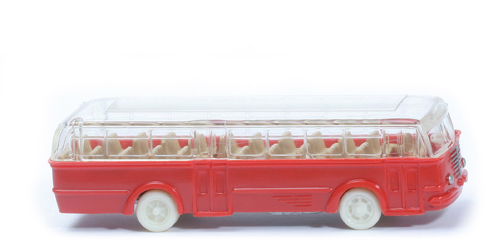 | Karosserie | Typ Karosserie | Typ 1 | Farbe | blassrot | Scheinwerfer | konvex | Grill | alt | unterer Türabschluss | tiefer als Karosserie | angedeutete Fenster in Türen | gerundet | Heck | Version 1 | Heckbeschriftung BÜSSING | dünn, die beiden "S" so groß wie Restschrift | Rückleuchten | ohne | Nummernschild hinten | ohne | Bodenprägung | ohne | Chassishalterungen | eckig | | Dach | Typ Dach | glatt, ohne Lüfter | Fenster | gerundet | | Inneneinrichtung | Typ Inneneinrichtung | Sitze grob | Farbe | beige | Lenkrad | an Karosserie | Lenkrad Farbe | weiß | Fahrer | ohne | | Chassis | Bodengruppe | Typ 1 | Chassis Farbe | mattes silber | | Räder | Typ | Trilex | Farbe | weiß |