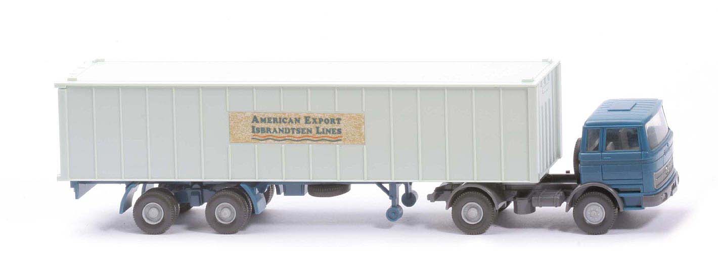 | | Zugmaschine | | Kabine oben | azurblau | | Kabine unten | azurblau | | Streifen | ohne | | Verglasung | klar | | Inneneinrichtung | ca. lichtgrau | | Lenkrad | ohne | | Grill | silbern | | Stoßstange, Radlauf vorn | staubgrau | | Chassistyp | neu | | Chassisfarbe | staubgrau | | Radlauf hinten | staubgrau | | Reserverad | hinter Kabine | | Sattelpfanne | neu, für dünnen Bolzen | | Räder | 12mm, Profil fein | | Felgen | silbergrau | | | Container | | Art | 1 x 40 ft gerippt | | Dach | helllichtgrün | | Korpus | helllichtgrün | | Türen | helllichtgrün | | Unterkante | schmal | | Beschriftung | AMERICAN ... (s. Foto) | | Beschriftung Grösse | 5 Felder, Papieraufkleber | | | Auflieger | | Farbe | azurblau | | Unterfahrschutz | ohne | | Königsbolzen | dünn | | Räder | 12mm, Profil fein | | Felgen | silbergrau |