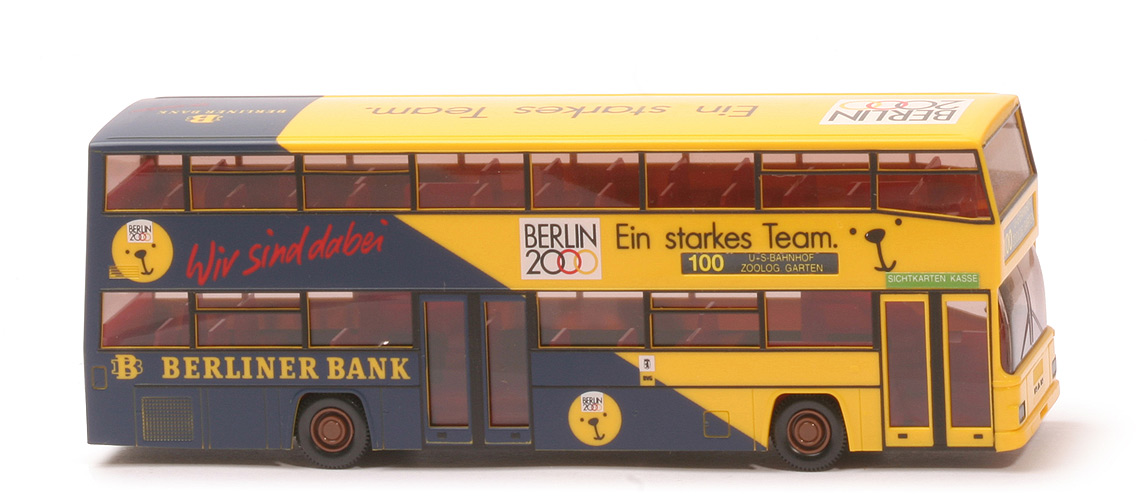 Farbe Aufbau | gelb | Scheinwerfer | silbern eingesetzt | Verglasung | rauch getönt | Farbe Inneneinrichtung | dunkles rot | Fahrer | ohne | Lenkrad | schwarz | Farbe Chassis | schwarz | Bodenprägung | neues WIKING-Logo, D 89, Germany | Beschriftung | umfänglich Berliner Bank etc. (... siehe Foto) | Schrift über Tür vorn | Sichtkarten Kasse | Beschriftung Art | Papieraufkleber, weiß auf maigrün | BVG-Emblem | beidseits | Zielangaben | 100, U-S Bahnhof Zoolog. Garten | Tür- und Fenstereinfassungen | schwarz bedruckt | MAN-Schriftzug vorne | schwarz bedruckt | Räder | 11 mm, schwarz | Radkappen | lehmbraun |