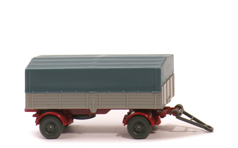 | Pritsche | Typ | hoch, Stirnwand erhöht, Unterseite glatt | Farbe | platingrau | Pritscheneinlage | silbern | | Chassis | Typ | Basis geschlossen | Farbe | weinrot | Bodenprägung | WIKING, Made in Germany, 40 g | Zughaken | integriert | Drehschemel | weinrot | Radlauf vorne | Typ 2, weinrot | Radlauf hinten | Typ 2, weinrot | Nummernschild | an der Rücklichtstange des Chassis | | Plane | Typ | hinten offen, gerafft | Unterversion | ohne Mittelsteg, Stecklaschen seitlich durchgehend | Prägung | WM, Nestkennung 2 Punkte | Farbe | mattgraublau | | weitere Details | Reserverad | unter Chassis (11 mm, 6-Loch) | Deichsel | angesteckt, Kunststoff | Bemalung Nummernschild | ohne | Bemalung Rückleuchten | ohne | Räder Typ | 11 mm, 6-Loch, anthrazit |