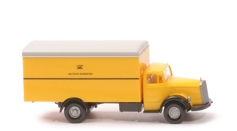 Fahrerhaus | gelb | Warndreieck auf Dach | ohne | Verglasung | klar | Inneneinrichtung | ca. lichtgrau | Lenkrad | separiert | Grill | silbern eingesetzt | Scheinwerfer | silbern eingesetzt | Kotflügel | schwarz | Chassis | schwarz | Kardanelement | schwarz | Bodenprägung | neues WIKING-Logo | Reserverad | unter Chassis | Kotflügel hinten | schwarz | Koffer Korpus | gelb | Koffer Türen | gelb | Kofferdach | silbergrau | Druck | Posthorn, "Deutsche Bundespost", ein Streifen | Räder | 12 mm, 2-teilig | Felgen | 6-Loch, silbern |