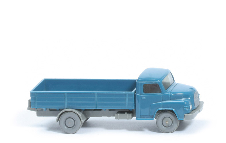 Modellversion | Typ 1 - Chassis alt, Pritsche alt | Farbe Kabine | azurblau | Verglasung | getönt | Grill | silbern eingesetzt | Bemalung | nur Scheinwerfer | Inneneinrichtung | ohne | Haltenasen Kabine | ohne | Chassis Art | Typ 1 | Bodenprägung | nur WM | Bereich Kardan hinten | offen | Rücklichtstange | ohne | Pritschenabstützung | punktuell | Arretierung Haltenasen | ohne | Chassisfarbe | betongrau | Pritsche Art | Normpritsche | Pritschenseiten | waagerechte Gravuren | Farbe Pritsche | azurblau | Rückleuchten | eingerückt | Kennzeichen | zweiteilig | Pritscheneinlage | ohne | Bemalung Rückleuchten | rot | Bemalung Kennzeichen | ohne | Räder | 11mm, glatt |