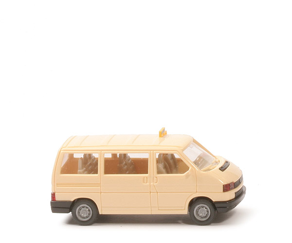Farbe Karosserie | creme | Taxischild | gelb, seitlich aufgesetzt, "Taxi" als Negativdruck | Grill und Lüftergitter | schwarz eingesetzt | Scheinwerfer | klar, eingesetzt | Blinker vorne | rot transparent, eingesetzt | Rückleuchten | rot transparent, eingesetzt | Verglasung | klar | Inneneinrichtung | Sitze 3-reihig, Lkr separiert | Farbe Inneneinrichtung | ca. hellelfenbein | Chassis Farbe | schwarz | Bodenprägung | neues Wiking-Logo, Germany | Beschriftung | ohne | Bemalung vorne | VW Emblem silbern (Druck) | Bemalung hinten | ohne | Räder | aufgezogene Reifen | Felgen | silbern |