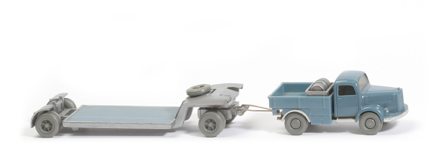 | Zugmaschine | Farbe Kabine | mattgraublau | Version Kabine | mit Schlitz hinter Nrn-Schild | Blinker | ohne | Verglasung | getönt | Dach | glatt | Bemalung | Scheinwerfer, Nummernschild | Chassis | Version 3a | Achshalterungen | offen | Chassis Farbe | lichtgrau | Bodenprägung | WM und Made in Germany | Pritsche | mattgraublau | Ladung | Kiste mit Öltonne | Farbe Tonne | silbern | Räder | 11mm, glatt | | Anhänger | Grundfarbe | silber | Hängertyp | Typ 2: Flachzapfenhalterungen | Bodenprägung | WM - Wiking - Germany - 49s | Pritscheneinlage | mattgraublau | Deichsel | Metall | Bemalung Rückleuchten | rot | Bemalung Rückstrahler | ohne | Räder | 12mm Trilex, einteilig | Farbe Räder | hellgrau |