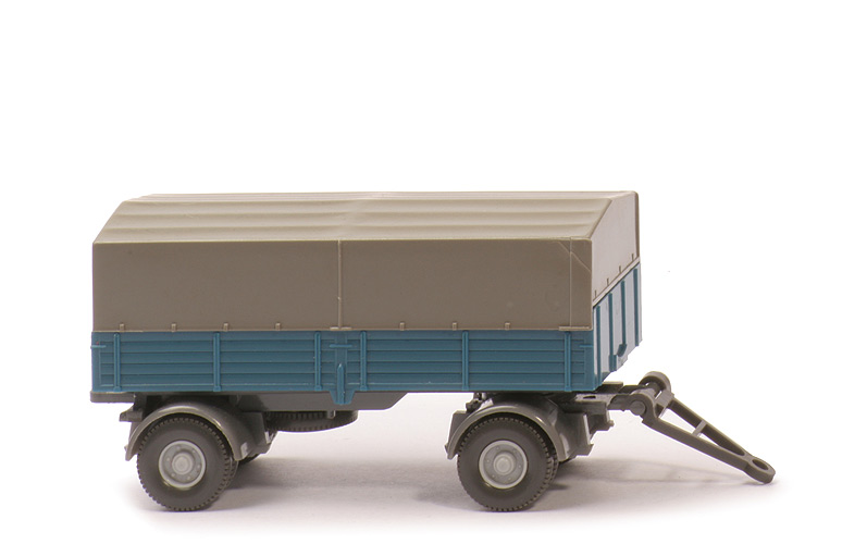 | Pritsche | Typ | hoch, Stirnwand erhöht, Unterseite glatt | Farbe | azurblau | Pritscheneinlage | silbern | | Chassis | Typ | Basis geschlossen | Farbe | basaltgrau | Bodenprägung | WIKING, Made in Germany, 40 g | Zughaken | integriert | Drehschemel | basaltgrau | Radlauf vorne | Typ 3, basaltgrau | Radlauf hinten | Typ 3, basaltgrau | Nummernschild | an der Rücklichtstange des Chassis | | Plane | Typ | hinten offen, gerafft | Unterversion | mit Mittelsteg, Stecklaschen: hinten 2, vorne durchgehend | Prägung | WM, Nestkennung 3 Punkte | Farbe | steingrau | | weitere Details | Reserverad | unter Chassis (12 mm, Felge silbergrau) | Deichsel | angesteckt, Kunststoff | Bemalung Nummernschild | ohne | Bemalung Rückleuchten | ohne | Räder Typ | 12 mm, Profil fein | Felgen | silbergrau, eingesetzt |