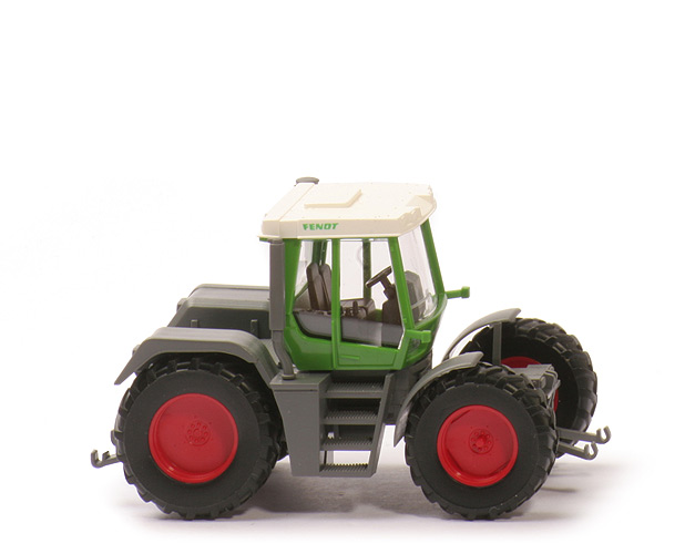 Dach | weiß | hier Druck seitlich | "Fendt" in gelbgrün | Kabine | gelbgrün | hier Druck vorne | "Fendt" in silbern | Verglasung | klar | Inneneinrichting | schwarz, Lkr separat | Ansaugstutzen | staubgrau | Auspuffrohr | staubgrau | Fahrwerk | staubgrau | Vorderachs-Segment | staubgrau, drehbar | Chassisplatte | staubgrau | Bodenprägung | neues WIKING-Logo, Germany | Räder vorne | Gummi, 18,6 mm | Räder hinten | Gummi, 20,4 mm | Felgen | 6-Loch rot |