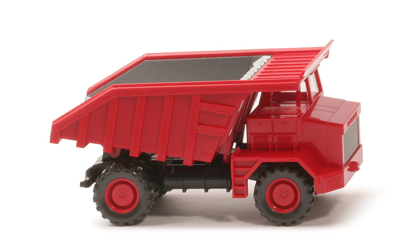 Farbe Kabine | rot | Verglasung | klar | Grill | silbern eingesetzt | Mulde | rot | Muldeneinsatz | silbern eingesetzt | Chassis | schwarz | Kardaneinsatz | schwarz | Bodenprägung | WIKING, Germany, 67 k | Kennzeichenhalterung | mit Verstärkung | Räder | 17 mm, Felgen eingesetzt | Felgen | 8-Loch, rot |