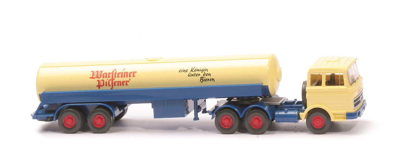 | Zugmaschine | Kabine | schwefelgelb | Spiegel, Scheibenwischer | mit | Verglasung | klar | Inneneinrichtung | schwarz, Lkr integriert | Grill | schwarz eingesetzt, Stern, Zierlinien gesilbert | Stoßstange | maritimblau | Chassis | maritimblau | Bodenprägung | WM und Germany | Halterung Pritsche | mit Arretierung für Lastpritsche | Radlauf hinten | maritimblau | Reserverad | hinter Kabine | Sattelpfanne | für großen Königsbolzen | Räder | 12mm, Profil grob | Felgen | 8-Loch, rot | Beschriftung Kabine Front | "Warsteiner" | | Auflieger | Tank | schwefelgelb | Galerie | maritimblau | Chassis | maritimblau | Achseinheit | maritimblau | Stütze | Hydraulikstempel, maritimblau | Reserverad | hinten unter Chassis | Beschriftung Tank Seite | "Warsteiner Pilsener ... (s. Foto) | Beschriftung Tank hinten | Warsteiner-Logo | Räder | 12mm, Profil grob | Felgen | 8-Loch, rot |