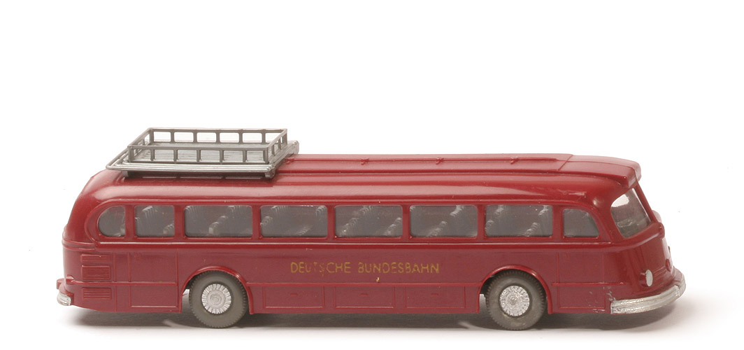 Verglasung | mit | Farbe Karosserie | weinrot | Dach Mittelbereich | mattiert mit Lüftern | Kombination Dach/Gepäckbrücke | Kombination 4 | Verglasung | leicht getönt | Sitze | silbern | Fahrer | anthrazit | Lenkrad | anthrazit, 4 speichig | Heck | mit angedeuteter Kupplung | Gepäckbrücke | ohne Mittelsteg | Chassis Farbe | basaltgrau | Chassis Typ | Struktur, BP WM | Bemalung vorne | Scheinwerfer, Stoßstange silbern | Bemalung Heck | Rückleuchten orange, Kennzeichen und Stoßstange silbern | Beschriftung | Deutsche Bundesbahn | Beschriftung Art | Druck | Räder | 12mm, einteilig, mit Profil | Radkappen | silbern bemalt |
