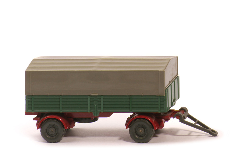 | Pritsche | Typ | hoch, Stirnwand erhöht, Unterseite glatt | Farbe | patinagrün | Pritscheneinlage | silbern | | Chassis | Typ | Basis geschlossen | Farbe | weinrot | Bodenprägung | WIKING, Made in Germany, 40 g | Zughaken | integriert | Drehschemel | weinrot | Radlauf vorne | Typ 2, weinrot | Radlauf hinten | Typ 2, weinrot | Nummernschild | an der Rücklichtstange des Chassis | | Plane | Typ | hinten offen, gerafft | Unterversion | ohne Mittelsteg, Stecklaschen seitlich durchgehend | Prägung | WM, Nestkennung 3 Punkte | Farbe | steingrau | | weitere Details | Reserverad | unter Chassis (11 mm, 6-Loch) | Deichsel | angesteckt, Kunststoff | Bemalung Nummernschild | ohne | Bemalung Rückleuchten | ohne | Räder Typ | 11 mm, 6-Loch, anthrazit |