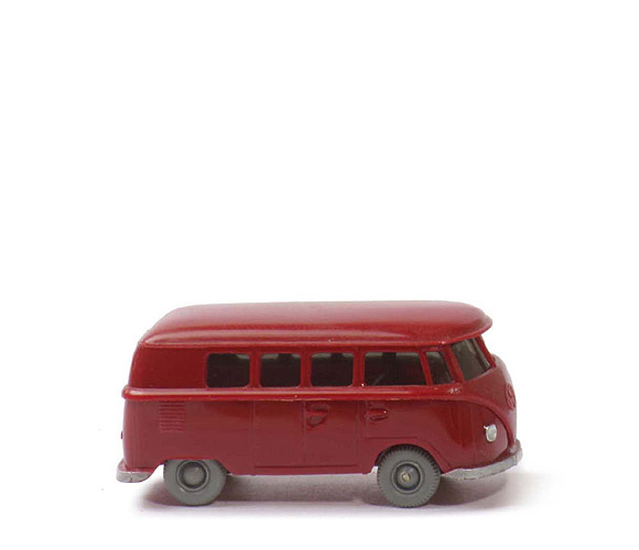 | Farbe Karosserie oben | weinrot | | Farbe Karosserie unten | weinrot | | Heckscheibe | klein | | Chassis | Teil des Karosserieunterteils | | Chassis Version | Typ A Nest 2 | | Bodenprägung | Made in Germany, WM | | Rückleuchten | gering erhaben | | Mittelholm | oben gerade | | Verglasung | Typ 1, getönt | | Inneneinrichtung | ohne | | Bemalung Scheinwerfer | silbern | | Bemalung VW-Emblem | ohne | | Bemalung Stoßstangen | ohne | | Bemalung Kennzeichen hinten | silber | | Bemalung Rückleuchten | ohne | | Räder | 8 mm, ca. staubgrau, Nabe gewölbt |