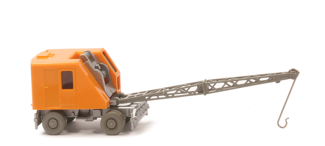 | Oberwagen Oberteil | chromgelb | | Scheinwerfer an Oberwagen | mit | | Rückleuchten an Oberwagen | mit | | Streben vor Dachlüfter | mit | | Verglasung | stark getönt | | Windeneinheit | einteilig, silbern | | Warnbake | ohne | | Oberwagen Unterteil | silbern | | Ausleger | 2-teilig, ca. betongrau | | Verseilung | vormals filigranes Gummi - fehlt hier | | Haken | Draht | | Verbindung Ober-/Unterwagen | vernietet | | Unterwagen Oberteil | silbern | | Unterwagen Unterteil | silbern | | hier Bodenprägung | Wiking Germany, 66 k | | Kardaneinsatz | silbern | | Räder | 11 mm Glattwand | | Beschriftung | ohne |