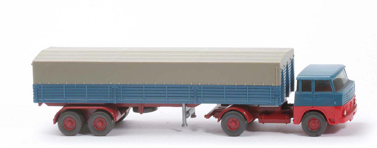 | | Zugmaschine | | Kabine oben | azurblau | | Kabine unten | rot | | Verglasung | getönt | | Stege für Inneneinrichtung | ja | | Chassistyp | neu | | Zughaken | ohne | | Fläche hinter Sattelpfanne | 3 Stege | | Chassisfarbe | hellbraunrot | | Sattelpfanne | für großen Königsbolzen | | Reserverad | unter Chassis gesteckt | | Räder | 12mm, Profil grob | | Felgen | hellbraunrot | | | Auflieger | | Farbe Pritsche | azurblau | | Pritschentyp | ohne Lasche | | Chassis | hellbraunrot | | Prägung Chassis | Wiking | | Pritscheneinlage | lichtgrau | | Achseinheit | hellbraunrot | | Typ Achseinheit | Germany/Wiking | | Königsbolzen | stark | | Stütze | starr | | Plane | Seite glatt, vorne Aussp | | Plane Farbe | olivgrau | | Räder | 12mm, Profil grob | | Felgen | hellbraunrot |
