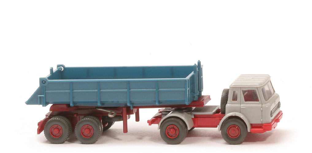 | Zugmaschine | Farbe Kabine | silbergrau | Lüfter | mit | Inneneinrichtung | rot | Verglasung | klar | Chassis | rot | Radlauf hinten | silbergrau | Sattelpfanne | für großen Königsbolzen | Reserverad | hinter Kabine | Räder | 12mm, Profil fein | Felgen | hellbraunrot | | Auflieger | Farbe Mulde und Klappe | azurblau | Farbe Chassis | rubinrot | Bodenprägung Chassis | Wiking Germany | Farbe Scharnierhalterung | rubinrot | Farbe Achshalterung | hellbraunrot | Bodenprägung Achshalterung | 67 S | Königsbolzen | stark | Reserverad | unter Chassis | Räder | 12mm, Profil grob | Felgen | hellbraunrot |