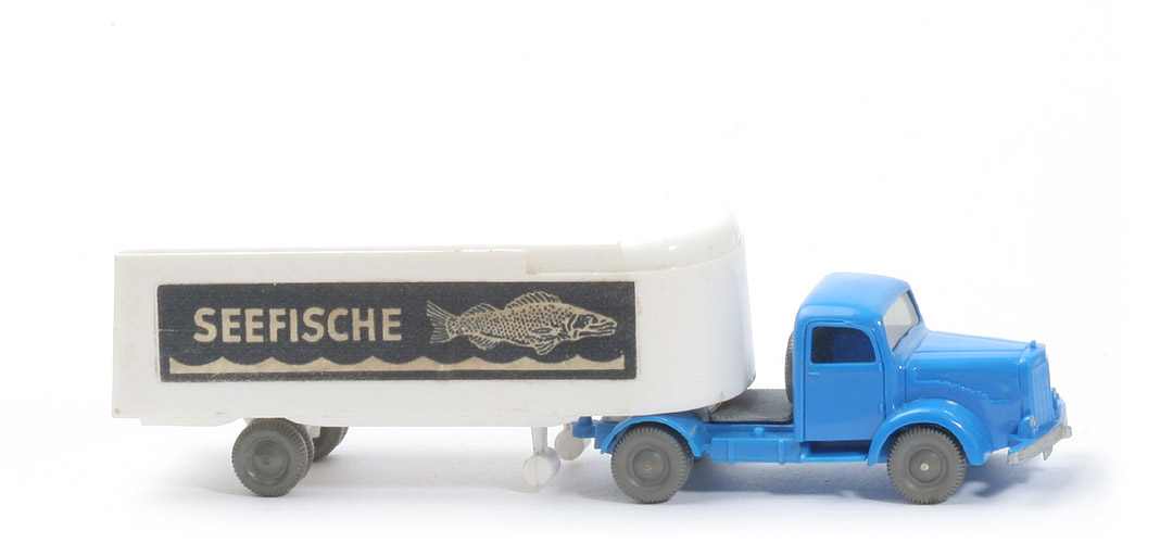 | Zugmaschine | Farbe Kabine | himmelblau | Farbe Chassis | himmelblau | Bemalung | Scheinwerfer, Stoßstange | Sattelpfanne | alt, ohne Steg, für kleinen KöBo | Achshalterungen | geschlossen | Bodenprägung | WM (ohne Kreis) | Reserverad | hinter Kabine | Räder | 10 mm, ältere Ausführung | | Auflieger | Farbe Oberteil | weiß | Farbe Unterteil | weiß | Radlauf | ohne Kotflügel | Bodenprägung | WM im Kreis | Rückleuchten | ohne | Dach | glänzend | Aufkleberart | Papier, matt | Beschriftung | Seefische (s. Foto) | Räder | 10 mm, ältere Ausführung |