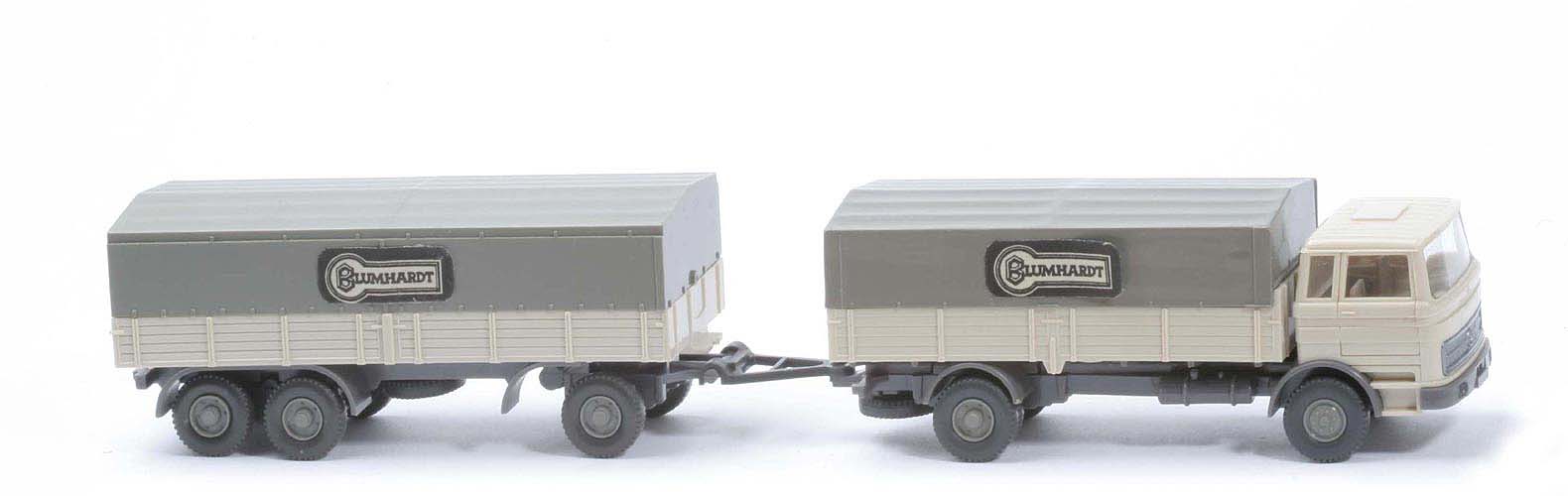 | | Zugwagen | | Kabine oben | hellelfenbein | | Kabine unten | hellelfenbein | | Streifen | ohne | | Verglasung | getönt | | Inneneinrichtung | ca. hellolivgrau | | Lenkrad | mit | | Stoßstange, Radlauf vorn | basaltgrau | | hier Aussparung | mit | | Chassistyp | Zughaken verstärkt | | Chassisfarbe | basaltgrau | | Radlauf hinten | basaltgrau | | Reserverad | gesteckt | | Pritsche | hellelfenbein | | Pritschengestell | basaltgrau | | Pritscheneinlage | lichtgrau | | Plane | betongrau | | Räder | 12mm, Profil grob | | Felgen | zementgrau | | Scheinwerfer | unbemalt | | | Anhänger | | Pritsche | hellelfenbein | | Chassis | basaltgrau | | Deichsel | Kunststoff | | Reserverad | mittig unter Chassis | | Pritscheneinlage | lichtgrau | | Plane | hellelfenbein | | Bereifung | Einfachbereifung | | Räder | 12mm, Profil grob | | Felgen | zementgrau | | Beschriftung | Blumhardt (s. Foto) |