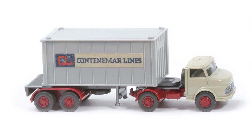 | Zugmaschine | Kabine | hellgelbgrau | Lüfter | mit | Eckfenster | ohne | Blinker | neben Scheinwerfern | Inneneinrichtung | ca. hellgelbgrau | Verglasung | leicht getönt | Chassis | hellbraunrot | Radlauf hinten | hellbraunrot | Sattelpfanne | für großen Königsbolzen | Reserverad | hinter Kabine | Räder | Profil grob | Felgen | hellbraunrot | | Container | Art | gerippt | Dach | silbergrau | Korpus | silbergrau | Türen | silbergrau | Beschriftung | Contenemar Lines (s. Foto) | Beschriftung Art | Papieraufkleber 7 Feld | | Auflieger | Farbe | basaltgrau | Variante | mit Markierung, BP 52 h | DAA Farbe | hellbraunrot | Achshalterung | Klemmplatte | Königsbolzen | stark | Räder | Profil grob | Felgen | hellbraunrot |