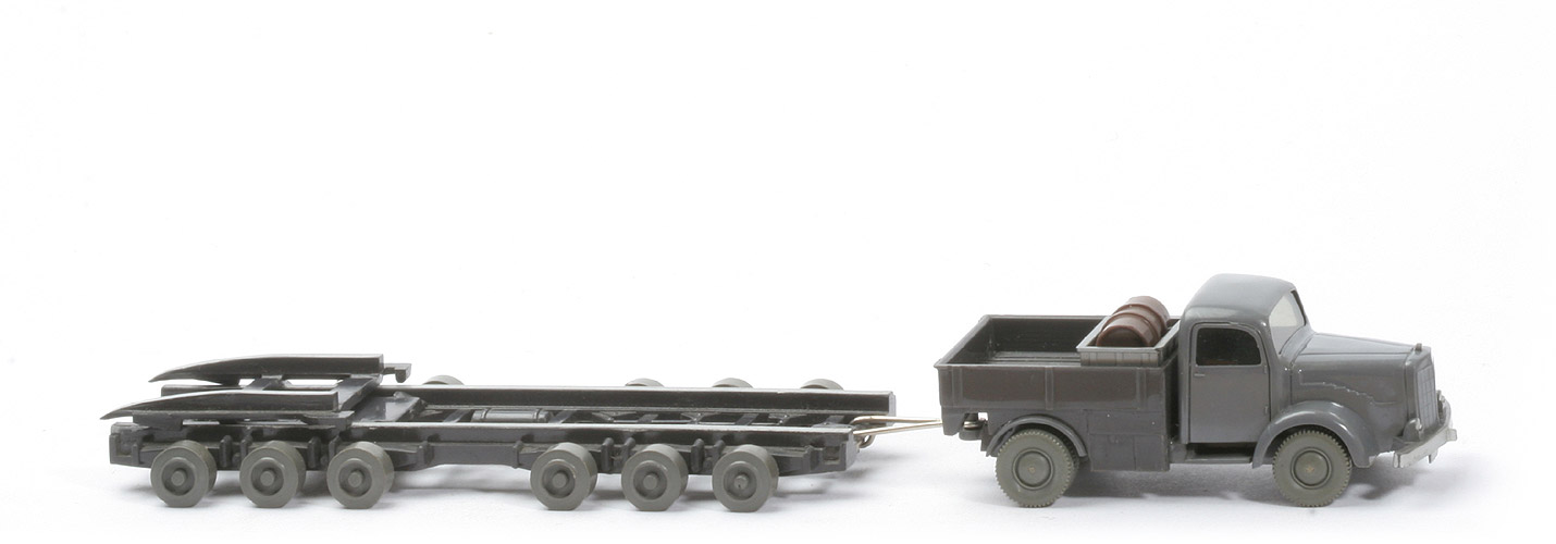 | Zugmaschine | Farbe Kabine | basaltgrau | Version Kabine | ohne Schlitz hinter Nrn-Schild | Blinker | ohne | Verglasung | getönt | Dach | glatt | Bemalung | Scheinwerfer, Nummernschild | Bemalung Stoßstange | mit | Achshalterungen | geschlossen | Chassis Farbe | basaltgrau | Bodenprägung | WM ohne Kreis | Pritsche | anthrazit | Ladung | Kiste mit Öltonne | Farbe Tonne | braunmetallic | Räder | 10mm, neuere Ausführung | | Anhänger Culemeyer | Farbe | anthrazit | Bodenprägung | WM im Kreis | Bremsplatte | Fläche glatt | Bemalung | Gleise silbern | Deichsel | Metall | Räder | Walzenräder 7,8mm o. Profil | Farbe Räder | hellgrau |