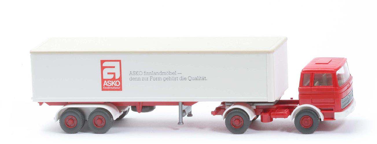 | | Zugmaschine | | Kabine oben | rot | | Kabine unten | rot | | Streifen | ohne | | Verglasung | klar | | Inneneinrichtung | ca. zementgrau | | Lenkrad | mit | | Grill | silbern | | Stoßstange, Radlauf vorn | weiß | | Chassistyp | neu | | Chassisfarbe | rot | | Radlauf hinten | weiß | | Reserverad | ohne | | Sattelpfanne | für großen Königsbolzen | | Räder | 12mm, Profil grob | | Felgen | hellbraunrot | | Beschriftung Kabine | ohne | | | Auflieger | | Kofferdach | hellelfenbein | | Koffer Korpus | weiß | | Türen | hellelfenbein | | Chassis | rot | | Achseinheit | weiß | | Beschriftung Seite | ASKO (s. Foto) | | Räder | 12mm, Profil grob | | Felgen | hellbraunrot | | Art der Beschriftung | Druck |