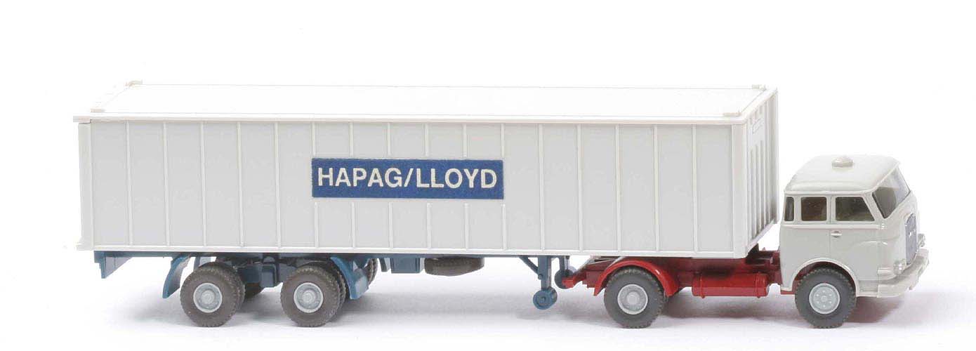 | Zugmaschine | Fahrerhaus | achatgrau | Verglasung | getönt | Sitze | betongrau | Kabinenboden | hellbraunrot (!) | Chassis | hellbraunrot | Sattelpfanne | für großen Königsbolzen | Fläche hinter Sattelpfanne | 3 Stege | Reserverad | unter Chassis gesteckt | Räder | Profil grob | Felgen | silbergrau | | Container | Typ | 40 ft, gerippt | Farbe Dach | grauweiß | Farbe Korpus | grauweiß | Beschriftung | Hapag-Lloyd | Beschriftung - Art | Papieraufkleber | Beschriftung - Grösse | 5 Felder | untere Kante | breit | | Auflieger | Bolzen | stark | Unterfahrschutz | ohne | Farbe | azurblau | Räder | Profil grob | Felgen | silbergrau |
