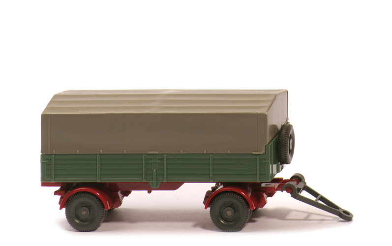 | Pritsche | Typ | hoch, Stirnwand erhöht, Unterseite glatt | Farbe | diamantgrün | Pritscheneinlage | silbern | | Chassis | Typ | Basis geschlossen | Farbe | weinrot | Bodenprägung | WIKING, Made in Germany, 40 g | Zughaken | integriert | Drehschemel | weinrot | Radlauf vorne | Typ 2, weinrot | Radlauf hinten | Typ 2, weinrot | Nummernschild | an der Rücklichtstange des Chassis | | Plane | Typ | hinten offen, gerafft | Unterversion | ohne Mittelsteg, Stecklaschen seitlich durchgehend | Prägung | WM, Nestkennung 2 Punkte | Farbe | steingrau | | weitere Details | Reserverad | an der Pritschenvorderseite | Deichsel | angesteckt, Kunststoff | Bemalung Nummernschild | ohne | Bemalung Rückleuchten | ohne | Räder Typ | 11 mm, 6-Loch, anthrazit |
