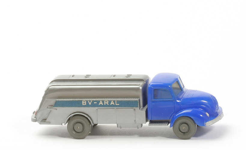 Farbe Kabine | ultramarin | Version Kabine | Typ 3a | Stoßstange | abgeschrägt | Kabinenboden | ohne Schlitz | Verglasung | getönt | Bemalung | Scheinwerfer, Stoßstange | Version Chassis | Version 3a | Achshalterungen | offen | Chassis Farbe | silber | Chassis Bodenprägung | WM (ohne Kreis) | Chassisplatte Farbe | silber | Chassisplatte Prägung | WM und Wiking | Chassisplatte Grösse | Typ 3 (Fläche 10 x 15mm) | Tank | silber | Beschriftung | BV - ARAL... (s. Foto) | Beschriftung Seite | Papieraufkleber | Beschriftung Heck | Papieraufkleber | Bemalung Rückleuchten | rot | Räder | 11mm, glatt |