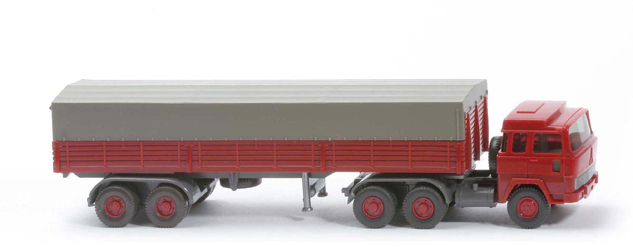 | | Zugmaschine | | Kabine oben | hellbraunrot | | Kabine unten | hellbraunrot | | Verglasung | getönt | | Inneneinrichtung | ca. hellolivgrau | | Lenkrad | ohne | | Grill | silber | | Chassis | basaltgrau | | Radlauf hinten | basaltgrau, 1-teilig | | Sattelpfanne | für großen Königsbolzen | | Reserverad | hinter Kabine | | Räder | Profil grob | | Felgen | hellbraunrot | | | Auflieger | | Farbe Pritsche | hellbraunrot | | Pritschentyp | Holzpritsche ohne Lasche | | Chassis | basaltgrau | | Königsbolzen | stark | | Pritscheneinlage | lichtgrau | | Typ Achseinheit | Germany/Wiking | | Doppelachsaggregat Farbe | basaltgrau | | Bodenprägung Achseinheit | Germany, Wiking | | Reserverad | ja | | Stütze | starr, silbern, Hydraulikstempel | | Plane | betongrau | | Plane Art | Seite 1 Mark., vorne offen | | Beschriftung | ohne | | Räder | Profil grob | | Felgen | hellbraunrot |