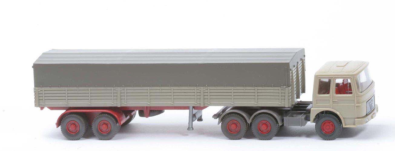 | | Zugmaschine | | Fahrerhaus | gelbgrau | | Verglasung | klar | | Inneneinrichtung | ohne Lenkrad, rot | | Spiegel | keine | | Scheibenwischer | keine | | Lüftergitter | ohne | | Grill | silbern, mit Löwe | | Motorblock | silbern | | Chassis | basaltgrau | | Radlauf hinten | 2-teilig, basaltgrau | | Räder | 12mm, Profil grob | | Felgen | hellbraunrot | | | Auflieger | | | Pritsche | | Art | Holzpritsche | | Typ | ohne Lasche | | Farbe | olivgrau | | Pritscheneinlage | basaltgrau | | | Chassis | | Radlauf | GERMANY WIKING | | Bodenprägung Chassis | WIKING | | Königsbolzen | stark | | Reserverad | ja | | Stütze | Stempel, silbern | | Chassisfarbe | hellbraunrot | | | Plane | | Art | vorne Aussparung | | Seiten | glatt, ohne 2 Stege | | Farbe | betongrau |