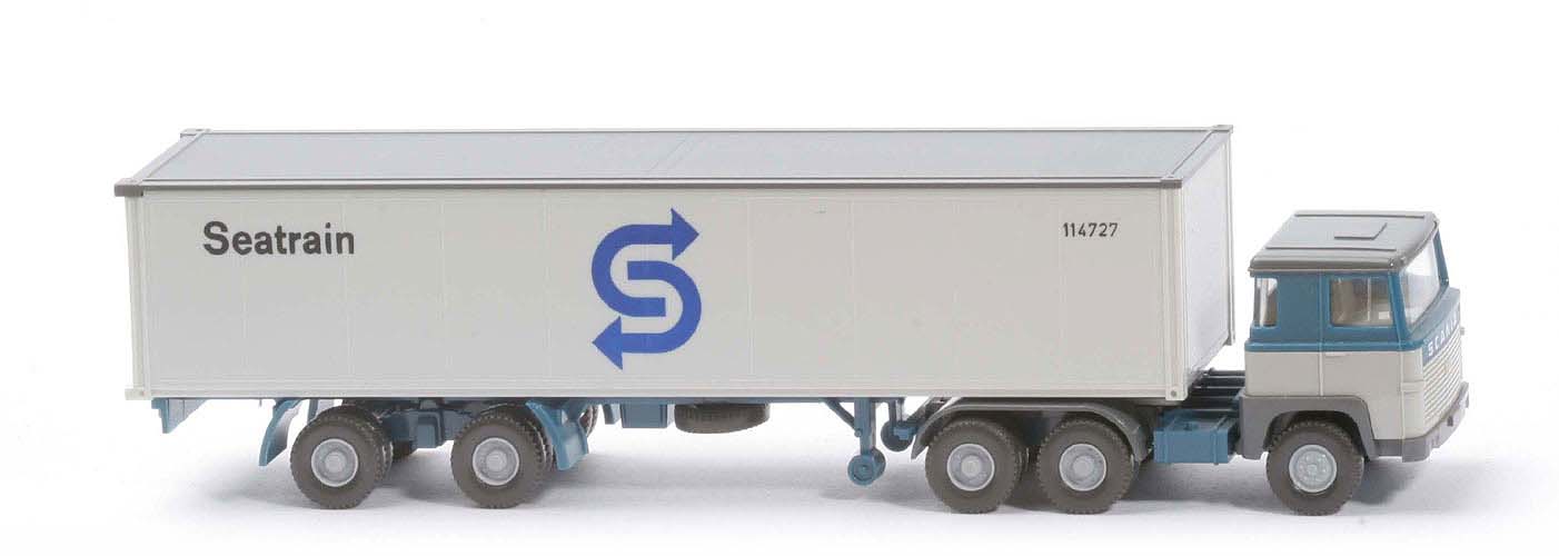 | Zugmaschine | Dach | basaltgrau | Kabine oben | azurblau | Kabine unten | lichtgrau | Stoßstange | basaltgrau | Frontbeschriftung | SCANIA breit | hier Farbhinterlegung | azurblau | Grill Prägung | mit 110 | Scheinwerfer | in der Stoßstange gesilbert | Spiegel | ohne | Scheibenwischer | ohne | Lenkrad | ohne | Sattelpfanne | für großen Königsbolzen | Reserverad | ohne | Chassis Farbe | azurblau | Räder | 12mm, Profil grob | Felgen | silbergrau | | Container | Art | 40 ft Glattwand | Dach | basaltgrau | Korpus | altweiß | Türen | neu, altweiß | Beschriftung | Seatrain ... (s. Foto) | Pfeile | ca. stahlblau | | Auflieger | Farbe | azurblau | Unterfahrschutz | ohne | Königsbolzen | stark | Räder | 12mm, Profil grob | Felgen | silbergrau |