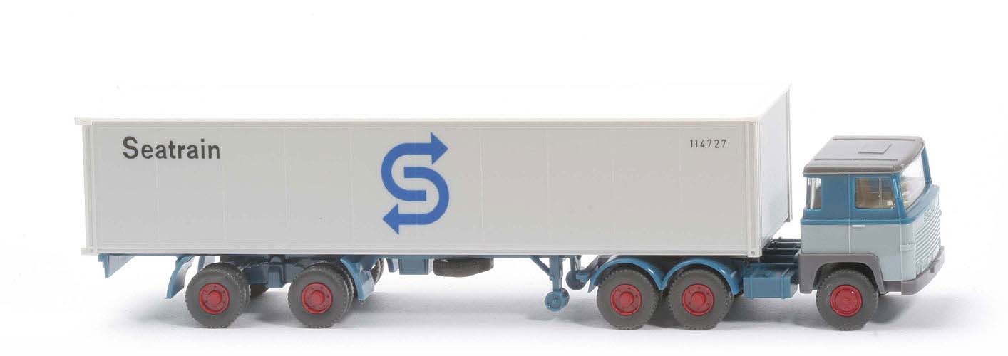 | Zugmaschine | Dach | basaltgrau | Kabine oben | azurblau | Kabine unten | hellblaugrau | Stoßstange | basaltgrau | Scheinwerfer | 2 ungesilbert | Spiegel | mit | Scheibenwischer | ohne | Lenkrad | mit | hinterer Radlauf | azurblau | Sattelpfanne | für großen Königsbolzen | Reserverad | ohne | Chassis Farbe | basaltgrau | Räder | 12mm, Profil grob | Felgen | hellbraunrot | | Container | Art | 40 ft Glattwand | Dach | weiß | Korpus | altweiß | Türen | neu, altweiß | Beschriftung | Seatrain ... (s. Foto) | Pfeile | ca. dkl-azurblau | | Auflieger | Farbe | azurblau | Unterfahrschutz | ohne | Königsbolzen | stark | Räder | 12mm, Profil grob | Felgen | hellbraunrot |