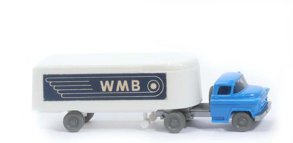 | Zugmaschine | Farbe Kabine | himmelblau | Farbe Chassis | silbern | Sattelpfanne | alt, ohne Steg, für kleinen KöBo | Zughaken | ohne | | Auflieger | Farbe Oberteil | weiß | Farbe Unterteil | weiß | Radlauf | ohne Kotflügel | Bodenprägung | WM im Kreis | Rückleuchten | ohne | Dach | mattiert | Aufkleber | eckig |