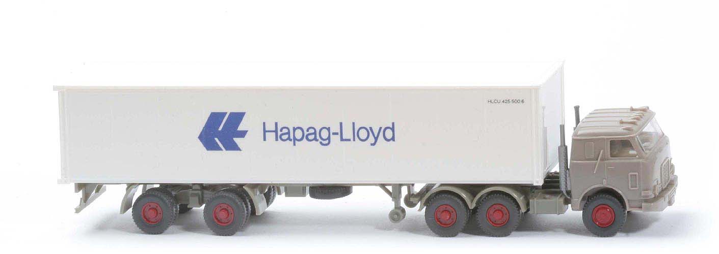 | Zugmaschine | Kabine | graubeige | Kabinen-Unterteil | graubeige | Verglasung | klar | Inneneinrichtung | ca. hellolivgrau | Auspuffrohre | 2, silber | Chassis | zementgrau | Radlauf hinten | zementgrau | Sattelpfanne | für großen Königsbolzen | Reserverad | ohne | Räder | Profil grob | Felgen | hellbraunrot | | Container | Art | Glattwand | Farbe | weiß | Türen | neu | Beschriftung | Hapag-Lloyd (s. Foto) | Beschriftung Art | 36mm, mit Nummer (Serie) | | Auflieger | Farbe | zementgrau | Unterfahrschutz | mit | Königsbolzen | stark | Räder | Profil grob | Felgen | hellbraunrot |