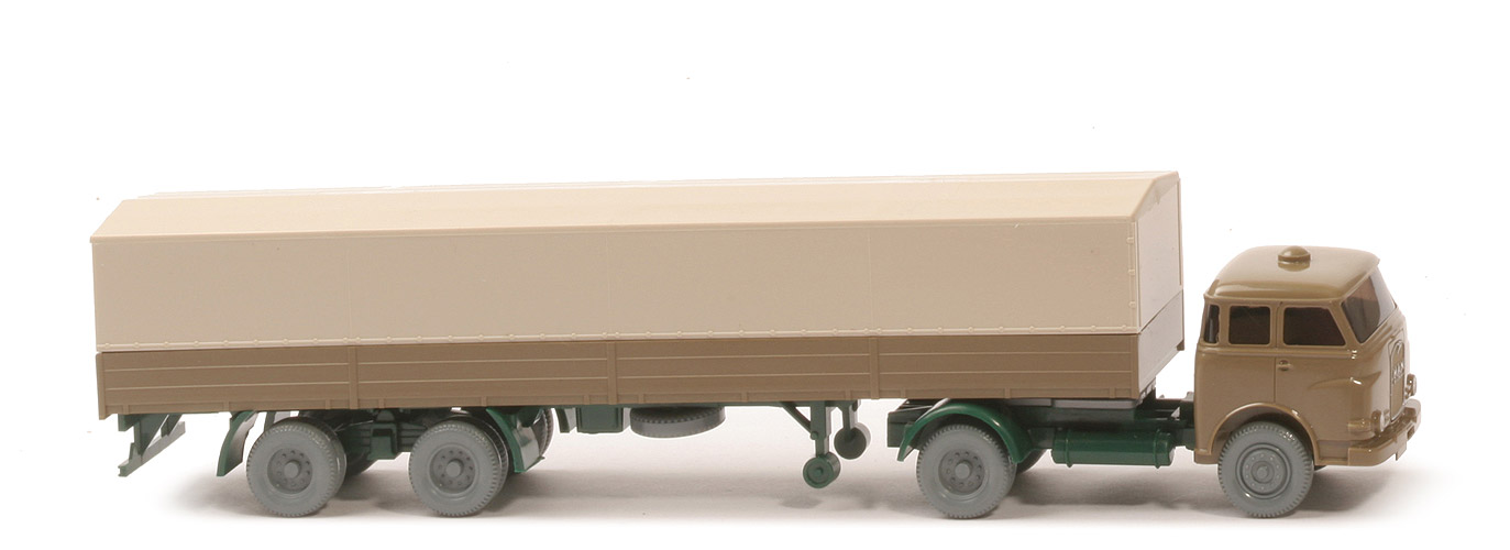 | Zugmaschine | Fahrerhaus | "hell-kakigrau" | Verglasung | stark getönt | Sitze | ohne | Grill | "hell-kakigrau", Rand und Schriftzug silbern | Scheinwerfer | silbern | Chassis | "moosgrün" | Chassis Bodenprägung | neues WIKING-Logo, Germany | Rücklichtstange | ohne | Reserverad | unter Chassis gesteckt (grobes Profil!) | Sattelpfanne | für großen Königsbolzen | Räder | 10-Loch, einteilig | Räder Farbe | ca. staubgrau | | Auflieger | Art | 4-fach-Teilung | Farbe Pritsche | "hell-kakigrau" | Pritscheneinlage | Papier, silber | Plane | ca. hellolivgrau | Chassis | "moosgrün" | Kotflügel | geschwungen | Reserverad | unter Chassis gesteckt (grobes Profil!) | Unterfahrschutz | mit | Bodenprägung | neues WIKING-Logo | Räder | 10-Loch, einteilig | Räder Farbe | ca. staubgrau |