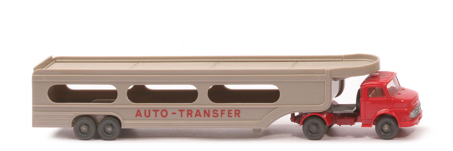 | Zugmaschine | Kabine | rot | Lüfter | mit | Eckfenster | mit | Blinker | auf Kotflügel | Verglasung | klar | Inneneinrichtung | ca. hellelfenbein | Bemalung | ohne | Farbe Chassis | hellbraunrot | Bodenprägung | Wiking Germany | Radlauf hinten | rot | Sattelpfanne | neu, für starken Bolzen | Reserverad | hinter Kabine | Räder | 11 mm, 6-Loch. Profil fein, anthrazit | | Auflieger | Seiten | graubeige | Mittelsegment | graubeige | Klappe | graubeige | Platte für Achshalterung | graubeige | hier Bodenprägung | WM ohne Kreis | weitere Bodenprägung Chassis | WIKING, 58, Germany | Königsbolzen | stark, auf runder Erhebung | hinteres Kennzeichen | unbemalt | Beschriftung | Auto-Transfer | Beschriftung Art | Druck rot | Räder | 11 mm, 6-Loch. Profil fein, anthrazit |