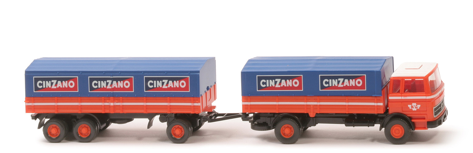 | Zugwagen | Kabine oben | orange, Dach weiß bedruckt | Kabine unten | orange | Streifen | weiß | Verglasung | klar | Inneneinrichtung | rot | Lenkrad | integriert | Grill, Stoßstange, Radlauf vor | schwarz | hier Aussparung | mit | Chassistyp | Neuauflage: neues WIKING-Logo, aber noch dicker Zughaken | Chassisfarbe | schwarz | Radlauf hinten | schwarz | Reserverad | gesteckt | Pritsche | orange | Pritschengestell | schwarz | Pritscheneinlage | silber | Plane | maritimblau | Räder | 12mm, Felgen 10 Loch, orange | Beschriftung | CinZano ... (s.Foto) | | Anhänger | Pritsche | orange | Pritscheneinlage | silbern | Chassisfarbe | schwarz | Hinterachsaufhängung | für Doppelbereifung | Bodenprägung | neues WIKING-Logo | Drehschemel | schwarz, BP 40 d | Reserverad | mittig unter Chassis gesteckt | Deichsel | schwarz, Öse groß | Plane | maritimblau | Räder | 12mm, Felgen 10 Loch, orange | Beschriftung | CinZano ... (s.Foto) |