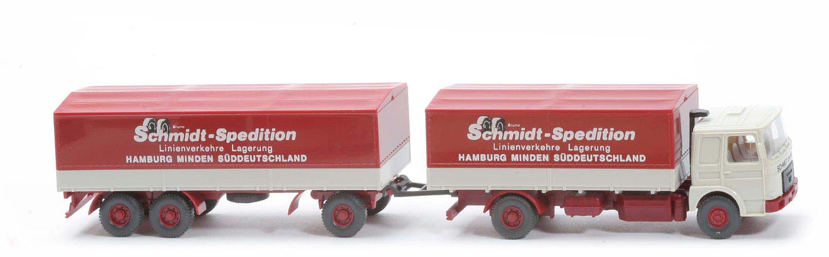 | Zugwagen | FH, Pritsche | grauweiß | Verglasung | klar | Inneneinrichtung | mit Lenkrad | Spiegel | mit | Scheibenwischer | mit | Dachlüfter | hoch | Grill | schwarz | Frontdruck | Schmidt Spedition | Chassis | rubinrot | Zughaken | klein | Plane | rubinrot | | Hänger | Pritsche | grauweiß | Chassis | hellbraunrot | Plane | rubinrot | Pritscheneinlagen | Pappe silber | Räder | 12mm, Profil grob | Felgen | hellbraunrot | Planendruck Seite | Schmidt - ... (s. Foto) | Planendruck Heck | Schmidt - ... (s.Foto) |